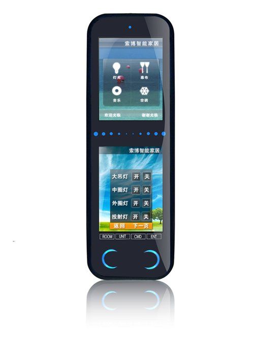 iRemote 具有兩塊TFT真彩液晶觸摸屏,兩塊觸摸屏可以互動工作。用戶可以方便的使用下屏對上屏進行翻頁或者頁面的直接挑轉;也可以用上屏對下屏進行翻頁或者頁面跳轉。這意味著我們可以用兩塊屏中的任意一個屏幕作為主操作屏來操作另外一塊屏幕的界面。當然每個屏幕也可以操作自己的頁面進 行挑轉。我們將全球銷量第一的任天堂NDS掌上游戲機的雙屏概念引入到智慧居家領域,並且由 NDS 遊戲機的單觸摸屏完美演化到了雙觸摸屏。兩塊觸摸屏的相互搭配使用為用戶帶來的從未有過的完美體驗。