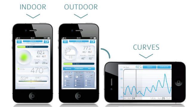 Netatmo 檢測的數據可以通過圖標顯示在應用程序的界面上,所有的數據記錄都永久儲存,你可以查看任意時間段的信息。通過CO2濃度傳感器可以測量城市污染對你的健康的影響,或其聲學舒適度傳感器向你的房東證明樓上的鄰居深夜影響到你的休息,當室內或室外的指標達到你的設定值時會向你發送通知。