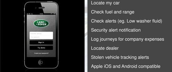 InControl應用程序– 能夠為蘋果或安卓客戶提供解決方案,以便為其車輛定位(並引導駛回車輛),檢查油位及燃油續航力,並檢查有無警報(如擋風玻璃清洗液不足等)。客戶還可進行全程記錄,並自動發送電子郵件,以完善支出記錄。該應用程序還使客戶能夠查找他們偏好或最近的經銷商,管理防盜警報,或(在不在車內的情況下)與路虎輔助呼叫取得聯繫。