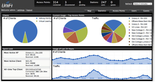 而這套無線AP控制台產品,與其他Thin-AP架構的產品相比,最為不同的是,當無線網路環境需要擴充時,熱點位置增加所需要建置的AP可以無限數量增長,且這個控制台因為是在使用者端的設備就可以運作,本身並沒有承載網路流量,所以當控制台因突發狀況而離線時,在區域內的網路傳輸並不會受到影響,還是能夠正常的運作。此外,這套系統也能夠經由跨網路的方式,來管理內、外部所有的AP。 另外,一般來說,同樣等級的無線控制台產品,支援管理AP數量為8~2,048台不等,但Unifi Controller無線網路解決方案,聲稱可支援的AP數量為無上限。 這套系統與其他的Thin-AP解決方案相比,只須裝置在用戶端的電腦上,本身不需承載網路流量,所有的流量傳輸還是交由防火牆來支撐,自然也沒有硬體效能上的瓶頸,因此可以做到支援AP數量無上限。