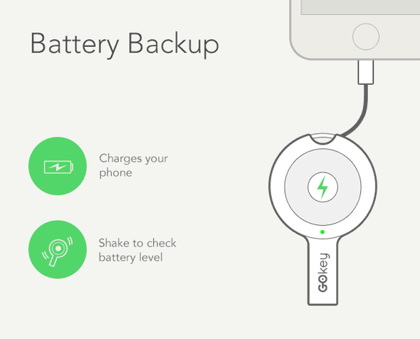 在不使用GOkey時,用戶可搖晃三次就會有LED燈為你提示它此時剩餘電量。而且電池在不為手機充電的情況下可以持續使用數週,在與手機連接時,手機應用程序上面就會提示你GOkey此時剩餘電量,讓你及時充電。
