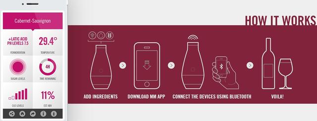 通過應用選擇喜歡的葡萄酒類型後,然後從Miracle Machine網站上購買所需要的酵母、葡萄濃縮汁等輔助原材料,再將水及在網上購買的原材料加入機器中並開始運轉。接下來就是等待,通過手機觀察和調節葡萄酒的釀製進展,這一釀酒的周期大約為三天,最後再加上一些讓它擁有舊橡木桶味道的粉末就大功告成了。